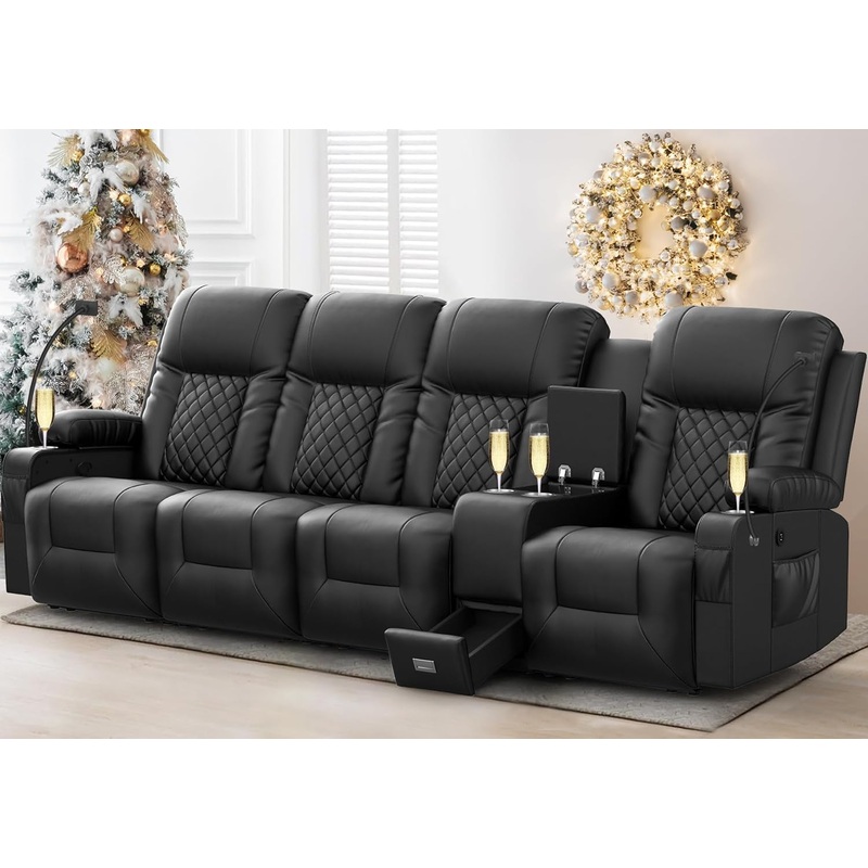 - Multi-Functional Storage ReclinerOur home theater 4-seater has four cup holders so you can enjoy your favorite drink or popcorn with friends on movie night without worrying about spills. Two side pockets and a center console with storage boxes and delicate drawers, provide dedicated space for your essentials, keeping your living area organized and clutter-free. The convenient hideaway storage keeps everything within easy reach.
