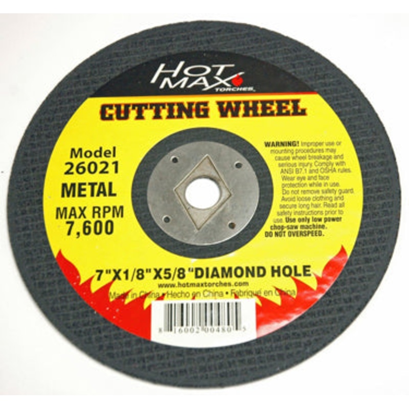 Cut off wheels. Diameter: 7. Thickness: 1/8. Diamond hole arbor: 5/8. Max RPM: 8,750.