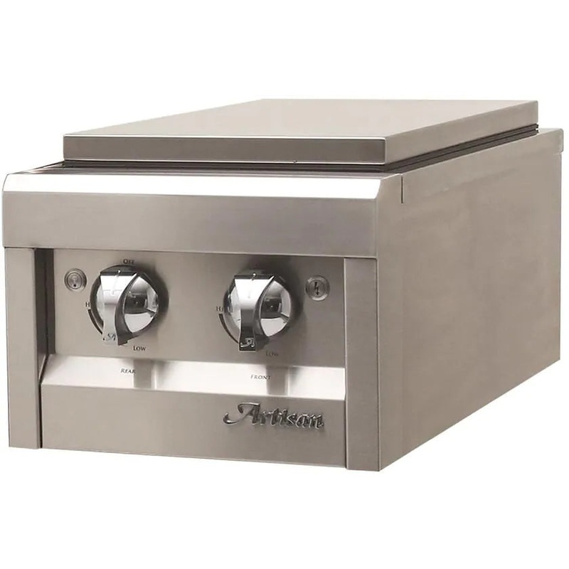 The Artisan Built-In Double Side Burner is a high-quality addition to your outdoor kitchen. Its heavy-duty stainless steel construction ensures durability and matches your Artisan grills aesthetics. The drop-in design allows easy integration into your grill island. It features two brass burners, each rated at 15,000 BTU, and a hinged stainless steel cover for protection when not in use. The electronic ignition ensures easy lighting, enhancing your outdoor cooking experience. This versatile appliance is designed to augment your outdoor kitchen space.