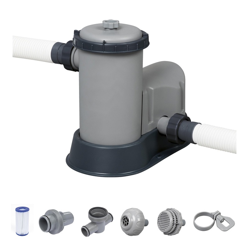 - Filter pump flow rate of 1,500 gallons per hour circulates water out of the pool through a filter and back again