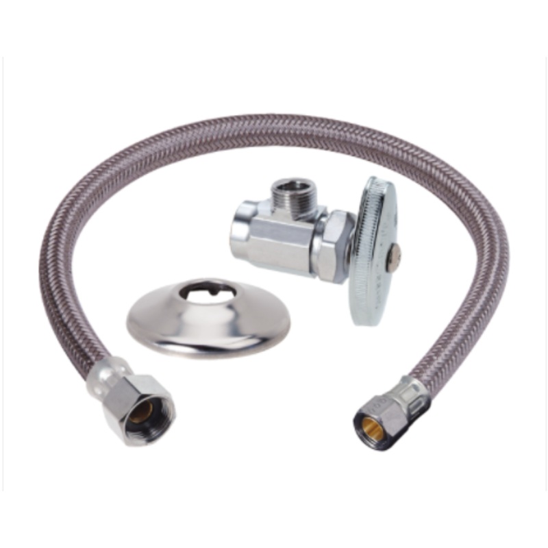 BrassCraft Faucet Supply Kit includes everything that you need to install the hot or cold water to your faucet. Components include: (1) 1/2 in. Nominal Sweat inlet x 3/8 in. O.D. Compression outlet multi-turn angle valve, (1) Speedi Plumb PLUS 3/8 in. O.D. Compression inlet x 1/2 in. FIP outlet braided water connector and (1) shallow flange. The water shut-off valve has an angle body which is most often used to connect to a water pipe that enters the room from the wall. With a few turns of the valve handle, you are able to stop the flow of water leading to the plumbing fixture, allowing for maintenance and repair without turning off water to the entire home. The flexible braided polymer connector features a high tenacity, multi-filament yarn, protected by a special polymer coating for optimum corrosion resistance and durability. The braided polymer fibers are designed to bend freely without kinking or crimping. This connector features BrassCrafts tough PVC inner hose to resist attack by chlorine, chloramines and other corrosive elements. Use to hookup cold or hot water supply.