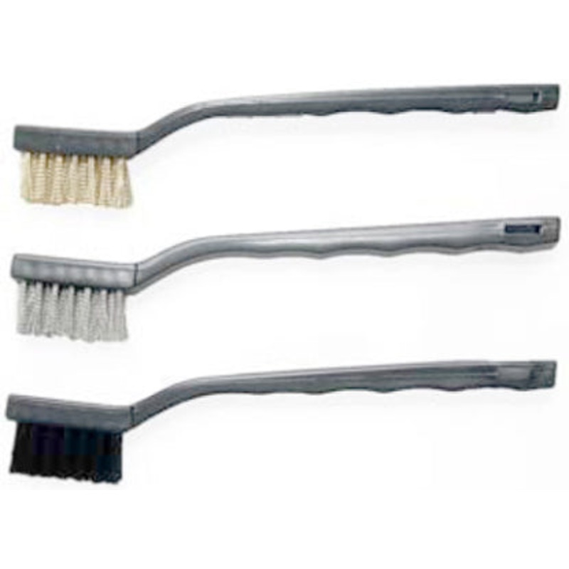 Toothbrush style wire brushes with plastic handles. Includes three brushes: nylon, brass, and stainless steel. 7-3/4 overall length. 3 pack.
