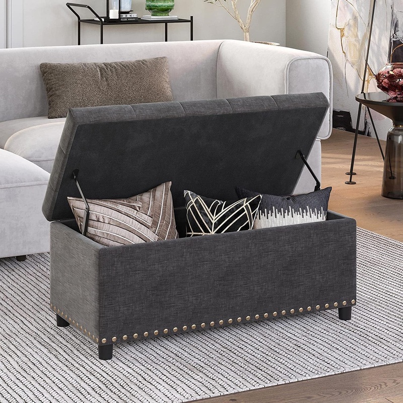 Button-Tufted Ottoman with Storage - Dark Grey Linen Upholstered BenchOrganize your living space in style with our elegant button-tufted ottoman in a sophisticated dark grey linen upholstery. This clean-lined rectangular ottoman offers both comfortable sea