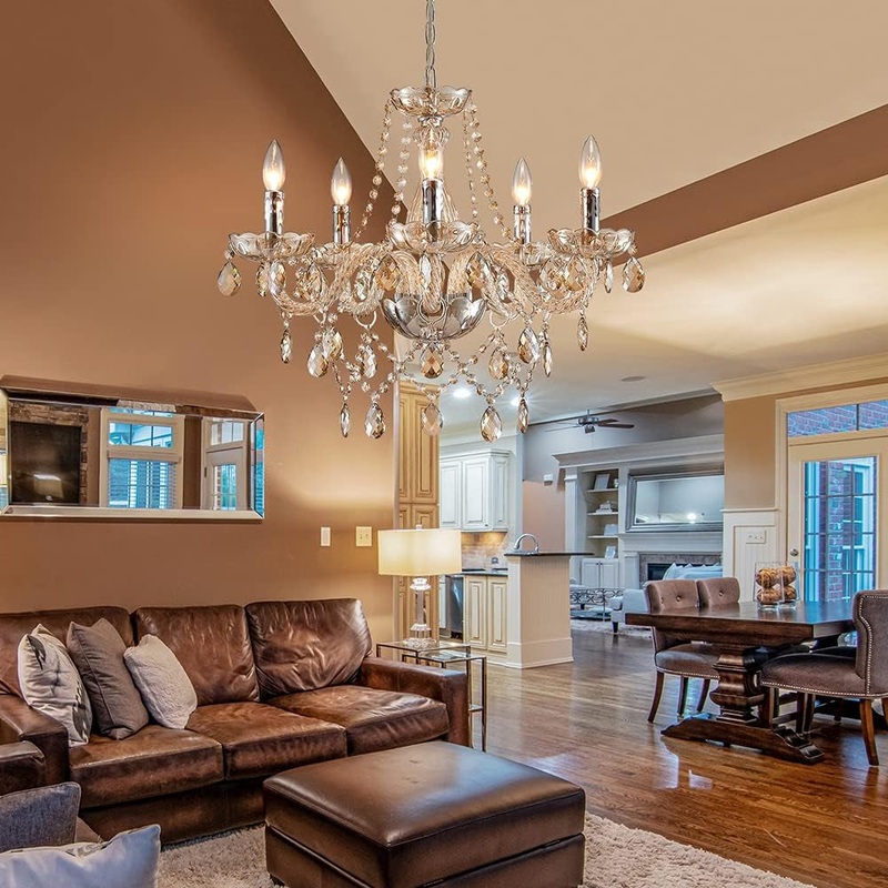 Introduce glamour and sparkle to your bedroom with this modern 5-light crystal chandelier in a sophisticated champagne finish. Its dazzling crystal chains and pendants create a luxurious and elegant ambiance.