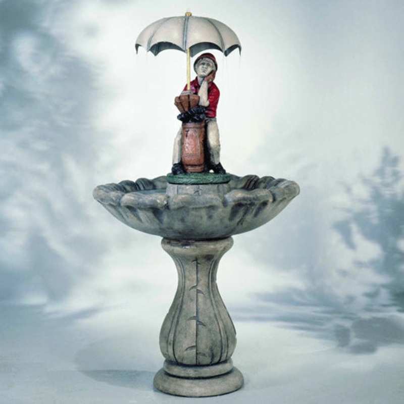 The Classic Golfer Garden Fountain features a golfer taking shelter under an umbrella,waiting for the rain to stop so he can resume his game.This water fountain is built from durable cast stone and is designed to last a lifetime. Several finishes are available.