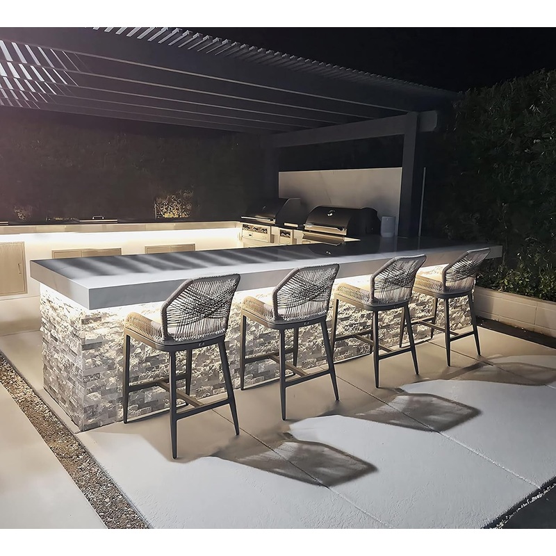 Stylish Outdoor Bar Stools Set with Cushions Elevate your outdoor space with our Stylish Outdoor Bar Stools Set. Designed for both comfort and aesthetics, these bar stools feature a hand-woven geometric backrest complemented by a sleek grey frame, creating