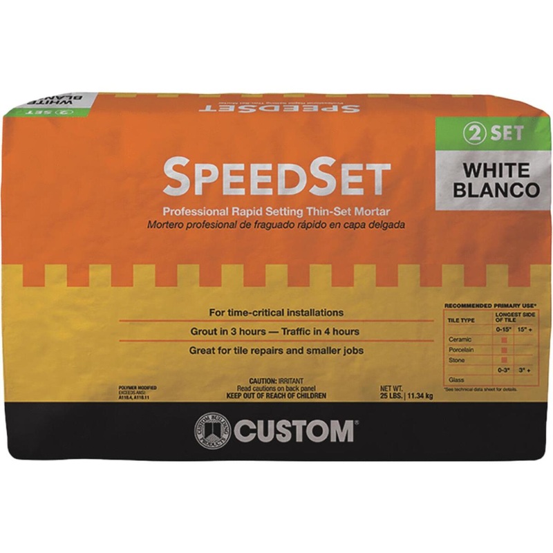 A quick-setting, polymer-modified mortar, excellent for commercial use and cold temperature installations, as well as small residential jobs and repairs. Quick curing properties allow for grouting in as little as 2 hours and light traffic in 6 hours. Product composed of a proprietary blend of Portland cement, inorganic aggregates, copolymers and chemicals. Suitable tile types include vitreous, semi-vitreous or non-vitreous tile (ceramic, mosaic, quarry, cement body tile), impervious porcelain and glass tile, brick and stone veneer, cement-based precast terrazzo, natural stone tile. Suitable substrates include concrete, mortar beds, masonry, Portland cement plaster, WonderBoard, cement backerboards, liquid applied waterproofing membranes such as RedGard and Custom 9240, crack prevention sheet membranes such as Crack Buster Pro, exterior grade plywood (interior residential and light commercial dry areas), gypsum wallboard (interior dry areas), existing ceramic tile, fully bonded sheet vinyl flooring, plastic laminates, cutback adhesive. Exceeds ANSI (American National Standards Institute) A118.4 and A118.11 standards without the need for additives. Square foot coverage per 25 lb bag: 45-50 sq ft (square foot) with 1/4′ x 1/4′ x 1/4′ square notch trowel, 20-25 sq ft with 1/2′ x 1/2′ x 1/2′ square-notch trowel.