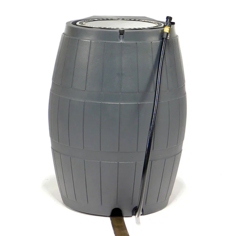 - Includes a debris screen, garden hose, shut-off thumb valve, hanging hose clips, overflow hose, and linking kit for connecting the barrels