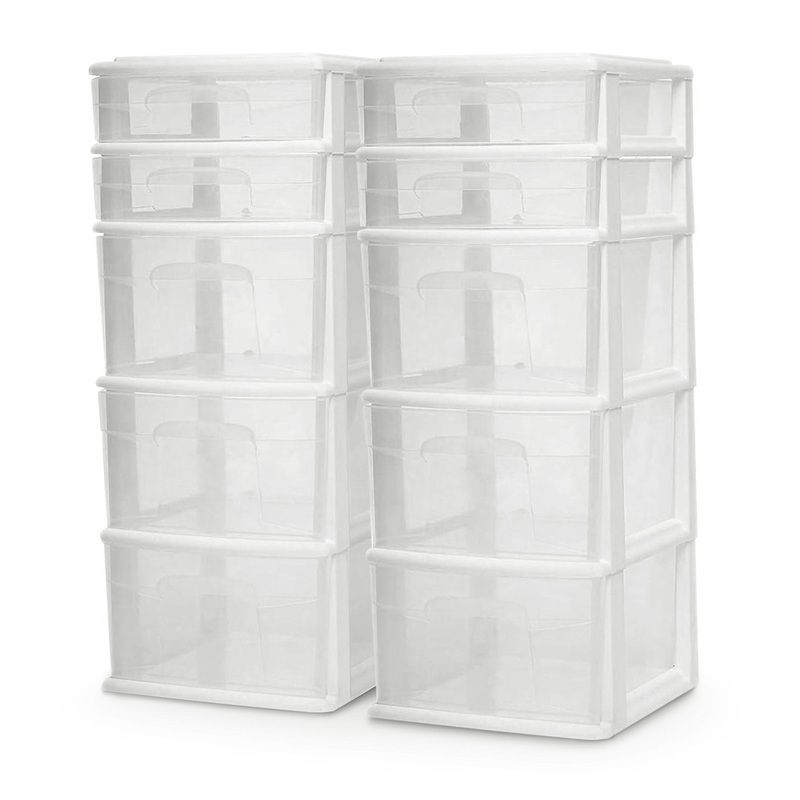 Homz Clear Plastic 5 Drawer Storage Container Tower, White Frame (2 Pack) (Used)