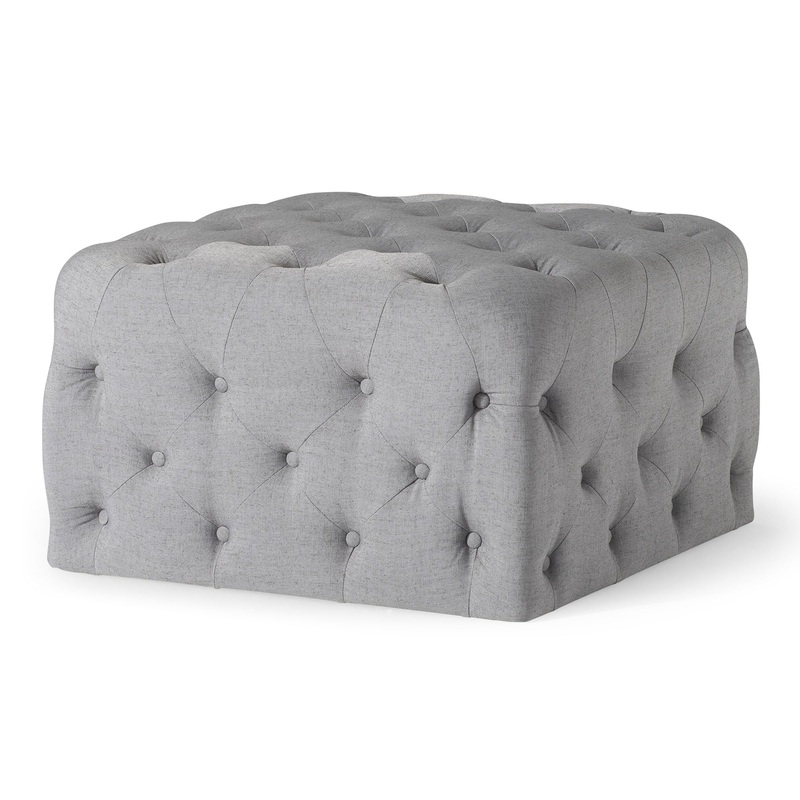 - Henry Upholstered Ottoman has a traditional aura with button-tufted detailing and premium fabric upholstery for a timeless, neutral look piece of furniture
