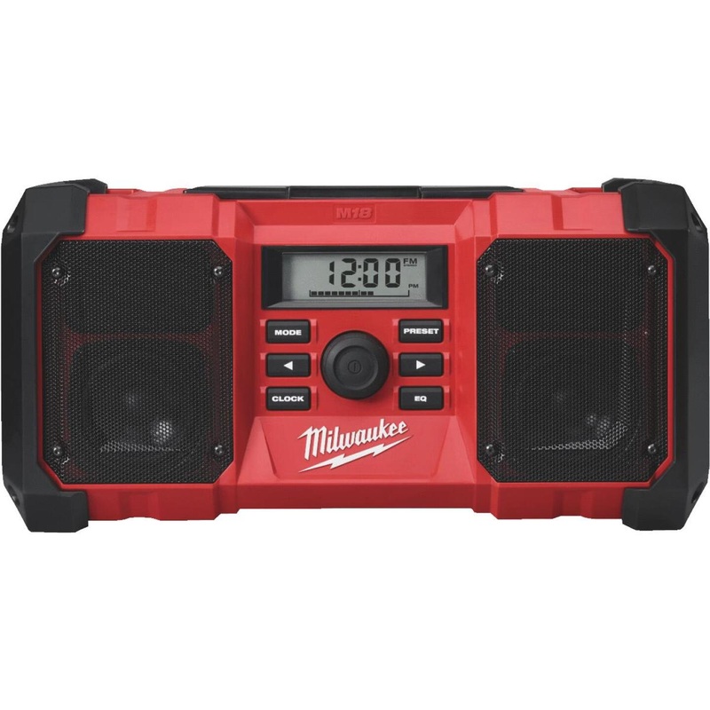 High performance audio system with dual 3′ speakers and passive radiators to deliver full-spectrum audio clarity. High reception accuracy and signal quality. Durable, portable, stackable design with shock absorbing polymer end caps and metal speaker grills to protect from drops, water, and debris on the jobsite. Integrated handles allow for easy transport and storage. Features weather sealed auxiliary compartment, customizable EQ (equalizer), digital AM/FM processor, 10 station presets (5 AM/5 FM), and 2.1A USB charger for portable electronic devices. Powered by M18 batteries (not included) or AC (alternating current) outlet. Up to 12 hours run time with an M18 5.0 Ah (ampere hour) battery. Bare tool – battery and charger not included.
