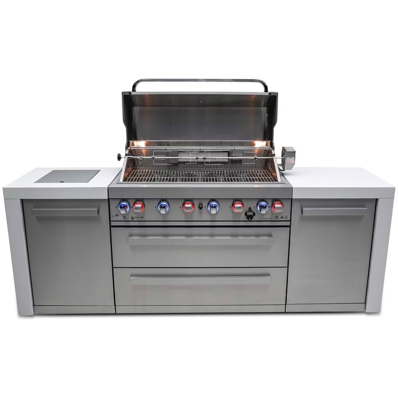 The Mont Alpi D series comes with waterfall granite which extends down the sides of the grill for easy cleaning and extra class, the unit also includes a heavy duty rotisserie kit, full size weather cover and a granite matching chopping board. The grill comes standard with LED knob lights that are blue when off and red when on and bright internal cooking lights for perfect vision and precision control. Be sure to check out the useful optional accessories such as the charcoal tray and griddle. Grill comes as propane ready but can be converted to Natural gas within minutes, simply buy the additional Mont Alpi Natural gas conversion kit.