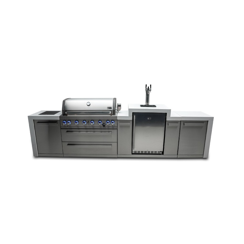 The Mont Alpi D series stands for deluxe and that is exactly what you get from the MAI805-DKEG. This grill combines six burners of standard cooking size along with an extremely useful infrared side burner suitable for searing, pan frying and boiling and an infrared rear burner for the ultimate rotisserie experience. The 3 pour kegerator with granite top and drip tray is perfect for 3 barrels of beer (or other) and is cooled in an outdoor rated fridge for that perfect ice cold pint.