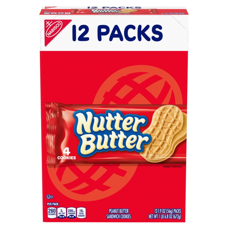 Nutter Butter Peanut Butter Sandwich Cookies satisfy the peanut butter lovers in your family with a snack that’s ready to enjoy. Made with real peanut butter, these cookies have a crunchy texture and a smooth, creamy filling between two crispy wafers for a sweet and savory snack. These sandwich cookies come in a peanut shape, making snacking fun for all ages. Individual 1.9 ounce snack packs each contain four cookies, making them perfect for lunches, road trips or on-the-go snacking. Sealed cookie packs keeps these cookies fresh until you’re ready to enjoy.