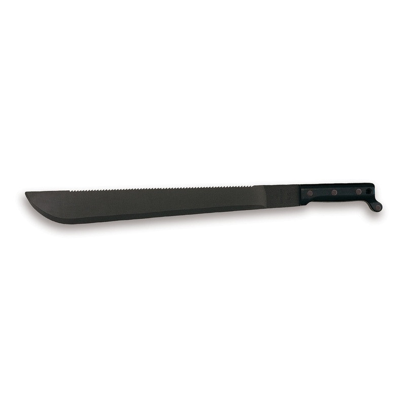 The 1-18 Sawback Machete is identical the 1-18 Military Machete, however there a serrations on the spine of the blade allowing for practical uses on both sides of the machete blade. The one-of-a-kind 1-18 Sawback Machete has been made by Ontario Knife Company under US Government specifications for 60+ years. The 18″ full tang, 1095 high carbon steel blade features a zinc phosphate finish and a Rockwell Hardness of 50-55 HRC. The 1-18 Sawback Machete blade is .12″ thick and is ground to a full flat taper with a flat bevel. A black molded plastic handle rounds out the 1-18 Military Machete. Overall the length of 1-18 Sawback Machete is 24″. The 1-18 Sawback Machete is available in a plain edge here. 18″ Machete sheath is sold separately.