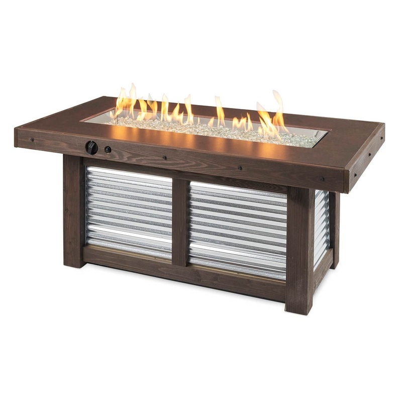 The Outdoor GreatRoom Company DENBR-1242 Denali Brew Linear Gas Fire Table, 56.5×29-Inchprovides a high quality outdoor gas fire feature. Featuring a durable Everblend modified concrete top with glass cover, corrugated galvanized metal base, and mocha-stained wood framing, this fire pit has been built to last–and look great doing it. Each Denali Brew fire table is unique thanks to coloring and pattern variations in the Sienna Suede top, ensuring your fire feature is one-of-a-kind. In addition, the included Crystal Fire Plus burner features complete 304 stainless steel construction for ultimate durability. The Crystal Burner design also ensures a realistic flame appearance thanks to its drilled burner port design and 80,000 BTU heat output. As added bonuses, the Denali Brew fire table stores a propane tank directly within the base for ultimate convenience and features a handy bottle opener right on the table base.