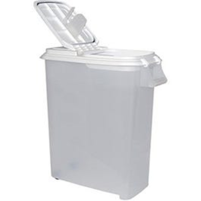80 qt, roll away pet food dispenser, holds up to 66 lb, bpa free, patented multi-function lids, bag in lid seal food fresh inside the bag, flip up pour thru spout or scoop, includes scoop, ez grip handle.