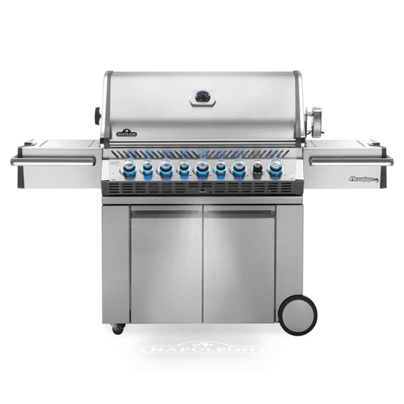The Stainless Steel Prestige PRO665RSIB Gas Grill features 8 burners, 99,000 total BTU’s, and 1140 square inches of total grilling areaThe 9.5 mm thick stainless steel cooking grids are virtually maintenance free and the unique wave shape provides even heating, prevents food from falling through, and produces exceptional sear marksLarge side shelves provide prep and staging space, while protecting the infrared sear station. The right side shelf hides an integrated ice bucket and cutting board allowing more prep space while keeping the chef and guests hydratedIgnite the Prestige PRO Gas Barbecue Grill instantly with the battery free ignition. This failsafe ignition system lights burners immediately with a jet of flameGet the perfect, steak house style, sear on steaks using the integrated sear station, infrared heat produces incredibly high temperaturesUse the sear station as a gas side burner as well for sauces, side dishes, and fryingThis grills storage cabinet is spacious for all of your favorite BBQ accessories. Interior lights ensure you can find everything easily, while soft close doors prevent slamming and wear and tear on the cabinet doorsDual level, stainless steel sear plates catch and vaporize any food drippings, protecting the stainless steel tube burners from damage and keeps your barbecue cleanerThe Prestige PRO665RSIB Propane Gas Barbecue features an infrared rear burner and comes with a commercial grade rotisserie kit for perfect spit roasted mealsChange the brightness and knob color of integrated lights, making your grill the life of the party! Set your favorite color or cycle through all of the colors