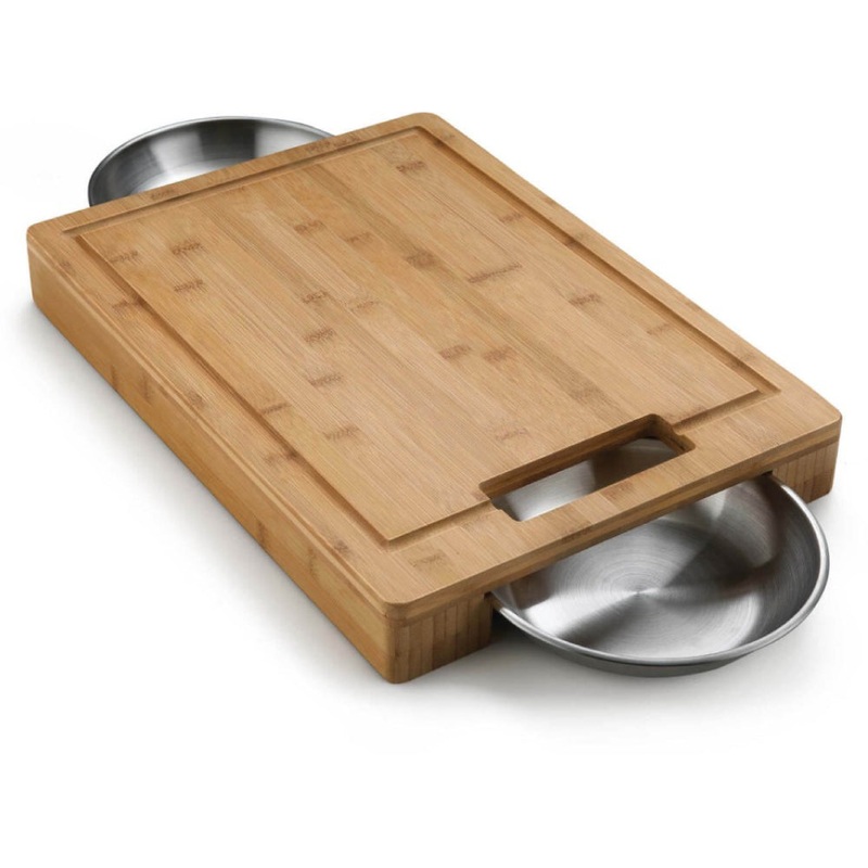Perfect for prepping food for the barbecue, this large bamboo cutting and carving board is naturally anti-microbialStainless steel bowls are perfect for catching juices and holding prepped foodsBowls slide into and store under the boardBuilt in trough catches and directs meat juices into the bowls, ideal for au jus and gravy makingThe cut-out in this board doubles as a handle and allows for collection of juices or chopped food into bowlsThe stainless steel bowls are dishwasher safeHand wash the bamboo board as needed