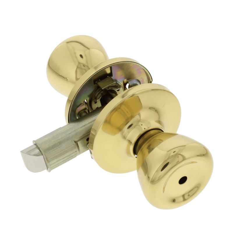 Replace broken or non-locking bedroom or bathroom door locks in your mobile home with this polished brass privacy door lockset. Its 2-3/8 in. backset ensures that it fits most pre-existing interior door holes, and it works on all doors from 1-3/8 in. to 1-3/4 in. in thickness. This set will fit on both left-handed and right-handed mobile home doors. After installation, simply turn the knob for privacy.