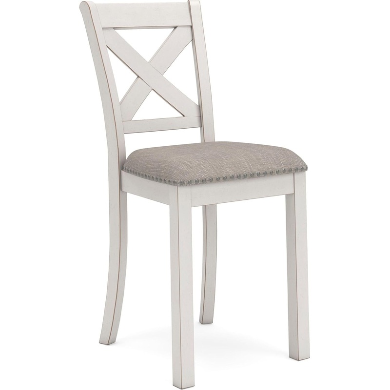 This counter height bar stool is sure to impress come mealtime. With its white finish and light gray upholstery, farmhouse-style seating has never been so fashionable. All thats missing is you and your family.