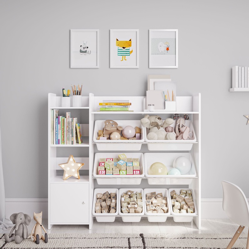 - Features a durable wooden organizer with 8 removable plastic bins, providing ample room for toys of all sizes