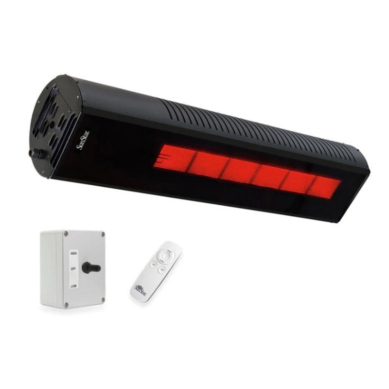 The SUNSTAR Model50L10 SGL1560infrared heater is completely hardwired and works in conjunction with a wirelessremote control. This modelheater is controlled through a simple (High/Low/Off)switch or wireless remote control that allows for an output of either 34,000 or 50,000 BTUs of heat with the ability to angle mount between15to 60 at a mounting height of 7′ to 10′ height.