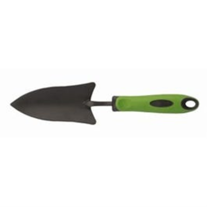 Green thumb, carbon steel blade transplanter, black powder coated finish, rust resistant, ergonomic tpr handle with hang up hole, 5 year warranty.