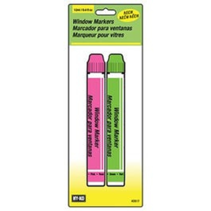 2 pack, neon window markers, 1 pink & 1 green, marks on any glass surface, easily removed, moisten surface & wipe clean with wet cloth or paper towel, non-toxic, conforms to safety requirements of astm d 4236.